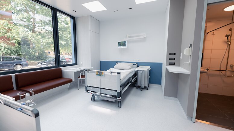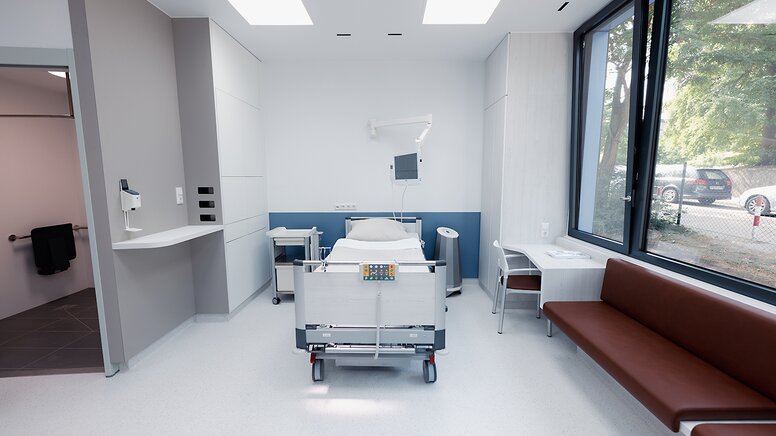 Blick ins PatientInnenzimmer der Zukunft. Hier gibt es zwei Bäder. Diese Aufteilung verhindert Kreuzkontaminationen und Kontaktinfektionen.