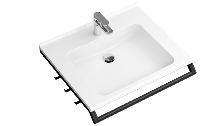 Das Prinzip der Flexibilität setzt sich auch in den Badezimmern fort. Eine praktische Lösung ist der modularer Waschtisch, der flexibel auf die individuellen Bedürfnisse der NutzerInnen reagiert. Er lässt sich schnell und einfach mit adaptiven Zusatzfunktionen wie Ablagen oder einer Handtuchhalterung erweitern und wieder zurückbauen. So finden alle Produkte für die tägliche Routine ihren Platz in greifbarer Nähe und fördern die Praktikabilität des temporären Wohnens.