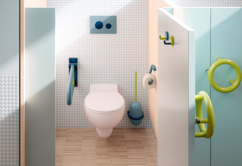 Diese Elemente tragen zur barrierearmen Nutzung bei und ermöglichen auch Kindern mit körperlichen Einschränkungen den sicheren Zugang zu den Sanitäreinrichtungen.