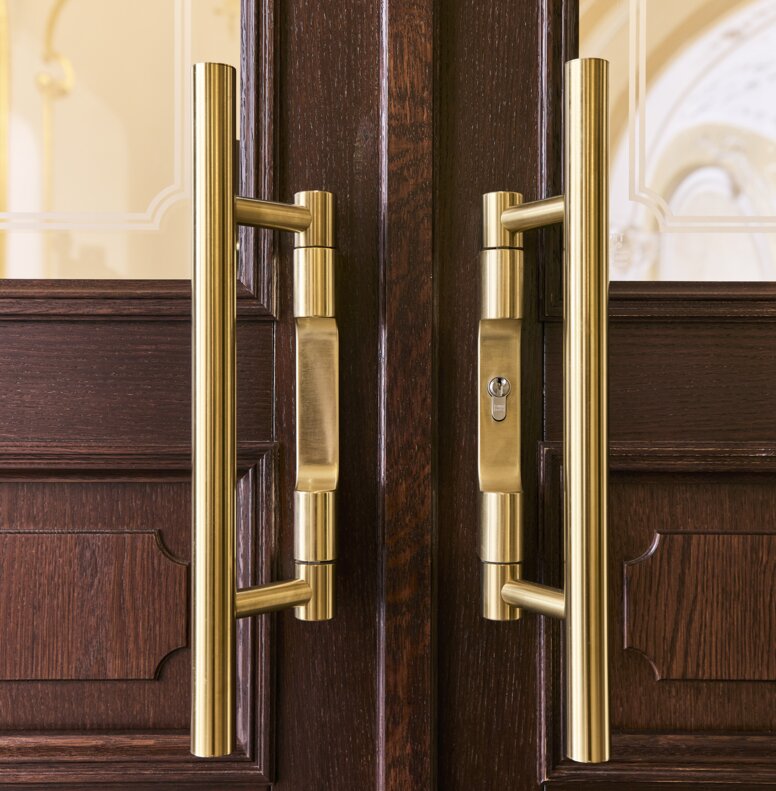 Für beide Türtypen suchten die Planenden nach einer passenden vertikalen Griffstange in Messingoptik, da solche auch an den historischen Türen verwendet wurden. Die Verwendung von heutzutage typischerweise horizontalen Drückerstangen war nicht zu vereinbaren mit den denkmalpflegerischen Ansprüchen. Dennoch mussten die neuen Brandschutztüren die Funktion als Flucht- und Rettungsweg gewährleisten. Fündig wurden die Planenden bei HEWI und der Drückergriffgarnitur aus dem System 162.