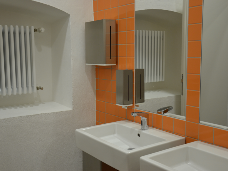 Despite the extensive restoration and renovation, the external appearance has been preserved. Inside, historical areas have been refurbished and combined with modern elements. The sanitary facilities did not meet the required specifications, so they had to be completely redesigned. Orange tiled walls now set colourful accents in the sanitary room. The stainless steel accessories are particularly easy to clean and robust. The dispenser systems at the washstand and WC also effectively increase hygiene - they make it easy to cleanly remove consumables such as soap or toilet paper.