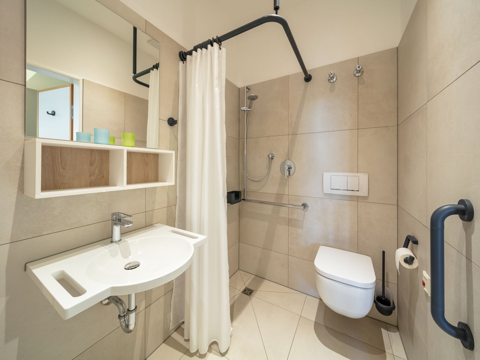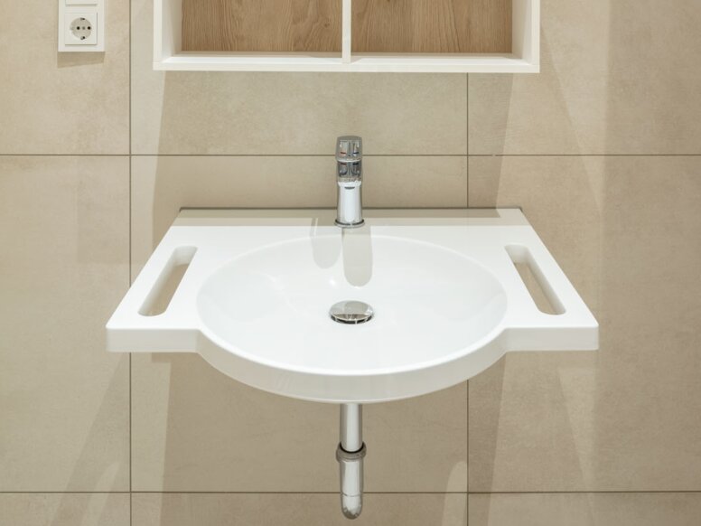 The HEWI washbasins with integrated accessibility are particularly useful. The shallow washbasin is accessible from underneath and practical grab rails provide reliable support.These can also be used as towel rails.