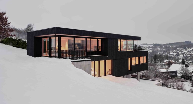 The architectural concept is based on the dialogue of the materials. Exposed concrete as a foundation is durable, load-bearing and robust. This contrasts with the warm wood of the upper floors, which symbolises lightness, openness and a closeness to real, everyday life. “These contrasts are not a contradiction: they are the real strength of the house,” emphasises Schönauer. In this interplay, an architecture unfolds that radiates both solidity and transparency. Large-format glass panes, precisely positioned vistas and a window seat with a panoramic view interweave the interior closely with the landscape. Inside and outside form a flowing continuum