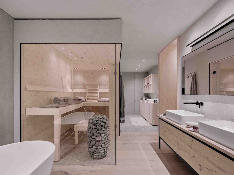 The property is located at the transition from an established village structure to an open landscape. Here, the terrain rises steeply, creating a component that is as complex as it is inspiring. Instead of levelling the terrain, the architecture responds to the existing topography: Two solid base storeys made of exposed concrete absorb the differences in height, accommodate circulation and functional spaces and convey a sense of earthiness and calm with their introverted presence. On top of this, two lighter storeys in a solid cross-laminated timber (CLT) construction open up to the surroundings. “It’s not about opposing the landscape, rather about absorbing its power,” explains Schönauer. This creates a clear spatial graduation: restrained and protected at the bottom, open, bright and expansive at the top.