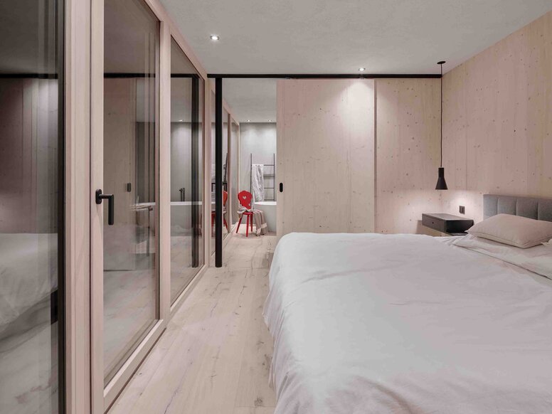The details are also consistently integrated into this clear spatial structure. The window and door furniture from the HEWI 270 range in black matt sets subtle but striking accents. “We chose HEWI because the hardware radiates calm with its reduced style and at the same time emphasises the materiality of wood and exposed concrete,” explains Schönauer. “They are understated but precise – exactly what we were looking for.” The hardware is particularly effective in combination with open-pored surfaces and solid components: They blend discreetly into the architecture and at the same time visibly enhance it in detail.