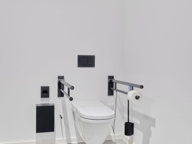 (toilet brush unit, toilet brush holder, disinfectant and soap dispenser, manual soap dispenser, Sensoric disinfectant dispenser, paper towel dispenser, paper waste bin, waste bin, hygiene bag dispenser, hinged support rails) - System 162