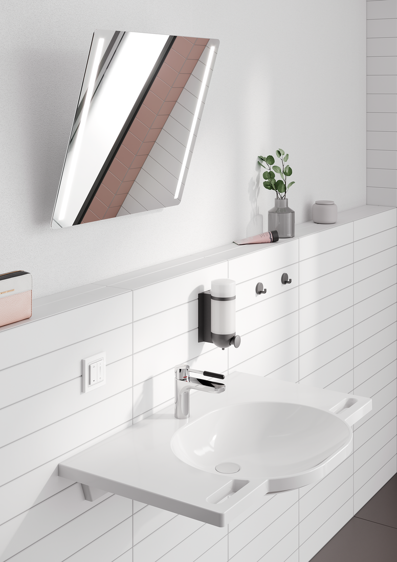 Above the washbasin, plan an accessible mirror directly above the edge of the washbasin. Patients can use this both when sitting and standing. If there is not enough space for this, a tilting mirror, which can be tilted according to the patient’s needs, can provide a remedy.