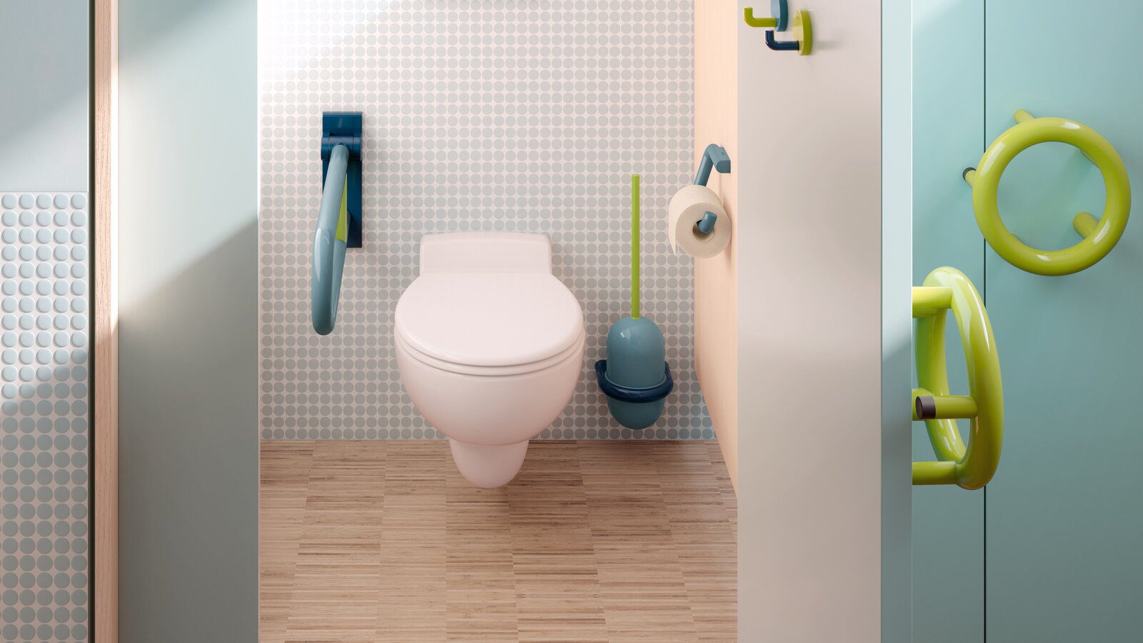 HEWI ICONIC stands for durable design that harmoniously combines form, function and quality. The range impresses in children’s areas with clear lines and a reduced, yet kid-friendly style. Be it in the sanitary area, in the cloakroom or for accessibility elements – ICONIC can be used in a variety of ways and offers great design freedom. The importance of visual orientation is particularly evident in the context of World Children’s Day 2025: With friendly colour combinations such as aqua blue, steel blue and may green as well as apple green, may green and coral, ICONIC not only creates an appealing environment, but also supports children’s spatial understanding and emotional perception.