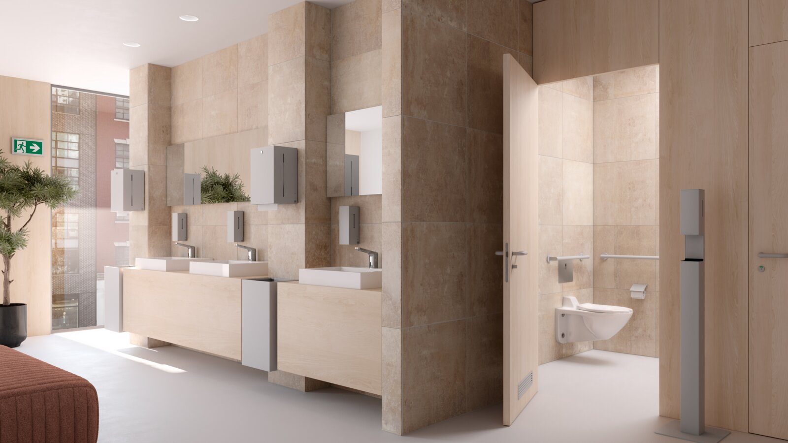 Combine standing sanitiser dispensers with other sanitary solutions. Soap and wall mounted sanitiser dispensers, paper towel dispensers and waste garbage cans are available in the same designs, creating an overall harmonious appearance.