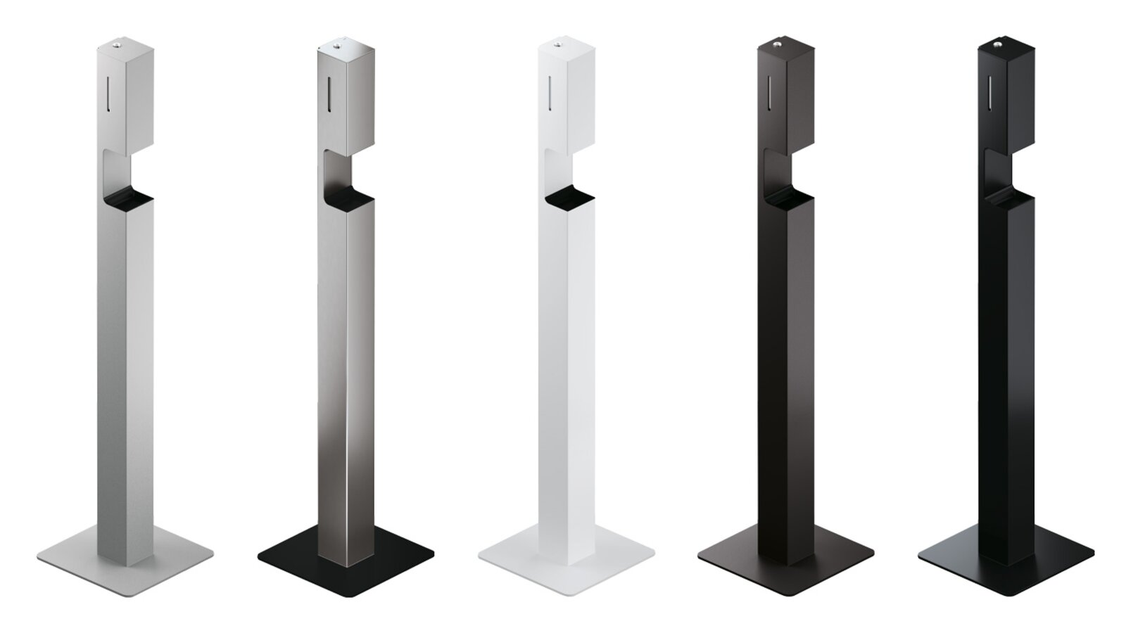 A hand sanitiser dispenser placed at the entrance of a building allows visitors to disinfect their hands. This reduces the transmission of pathogens to a minimum. Ideally, the dispenser should blend harmoniously with the surrounding of the entrance and yet remain immediately recognisable. This is made possible by giving the dispensers a minimalist design and a wide range of materials.