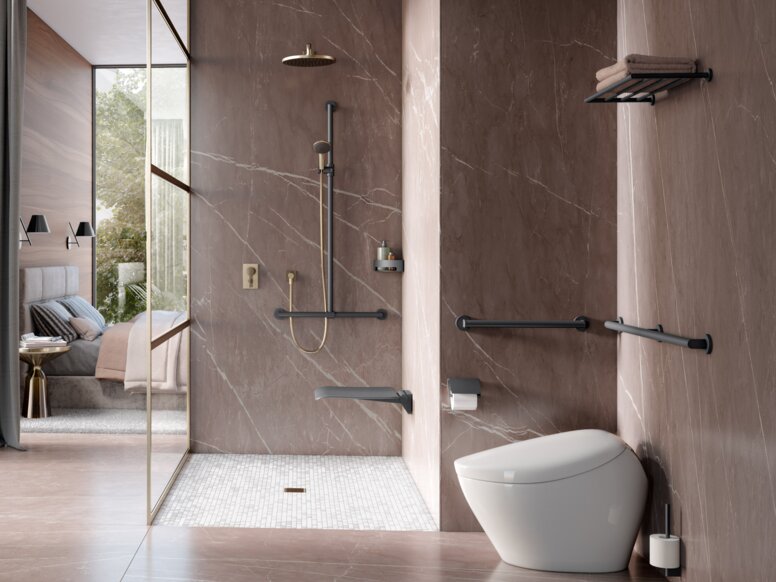 With shower seats, stools, support rails, hooks or shower holder systems, thermostats, shower curtains and shower shelves, you can design accessible showers and provide your customers with a comfortable showering experience.