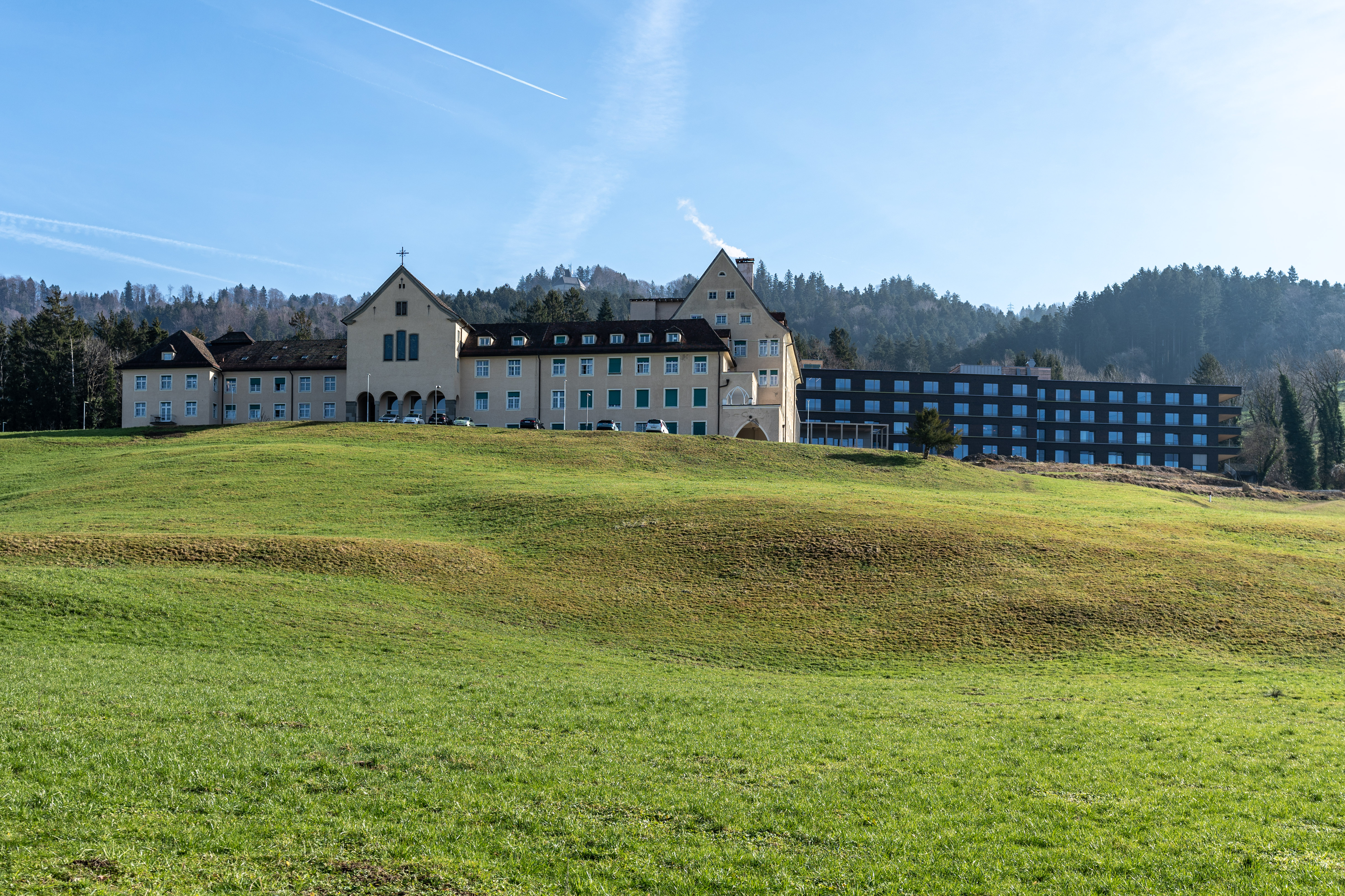 The design concept by the Vorarlberg architectural firm HK Architekten envisaged a mixture of new construction and conversion. Firstly, the south-facing residential wing, known as "Haus Pfänder", built in 1980 with 54 rooms and lounges, was demolished. In order to be able to realise the project during ongoing operations, a temporary, two-storey extension in a modular timber construction was erected to the north of the historic main building in collaboration with Kaufmann Zimmerei und Tischlerei GmbH, which provided accommodation for 36 residents during the construction work. The prefabricated and turnkey modules can be flexibly connected to one another. The concept proved to be economically and ecologically viable, as the modules are made of wood. Instead of releasing CO2 during the production of the modules, CO2 is stored in the timber construction.