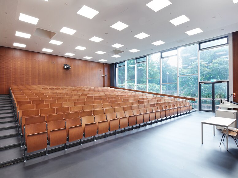 Auditorium D (Kokoschka Hall). Today, the chairs in the auditoriums are no longer empty. University operations were completely relocated to City North for the duration of the refurbishment.