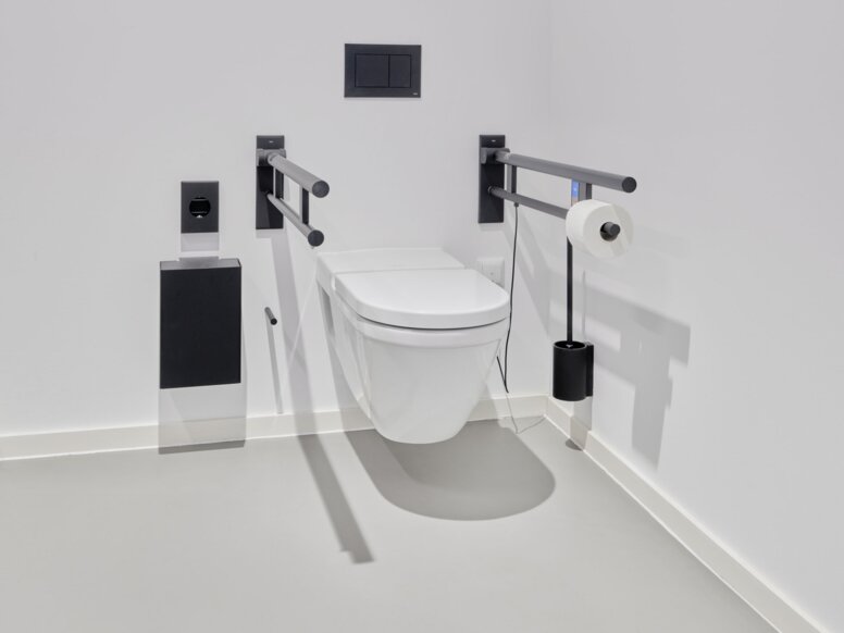• System 900 (toilet roll holder, toilet brush unit, disinfectant and soap dispenser, manual soap dispenser, Sensoric disinfectant dispenser, paper towel dispenser, wastepaper bin, wastebin, hygiene bag dispenser, hinged support rails)