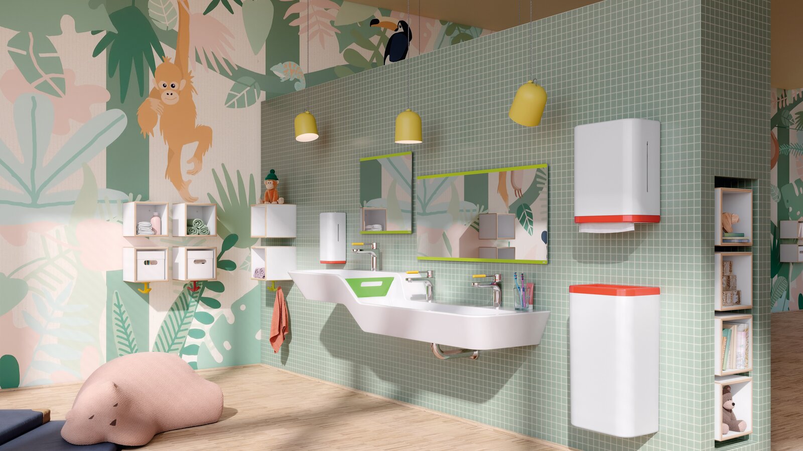 There are also suitable products for children: The HEWI washbasins for kids impress with their fine radii, which focus on the safety of the little ones. In addition to washbasins, the product range also includes mirrors. HEWI therefore meets the requirements for product solutions for kindergartens, daycare centres and schools. In addition to single and double washbasins, there are also row washbasins with height offset. In addition to classic white, HEWI offers a two-colour version in cheerful apple green or bright aqua blue.