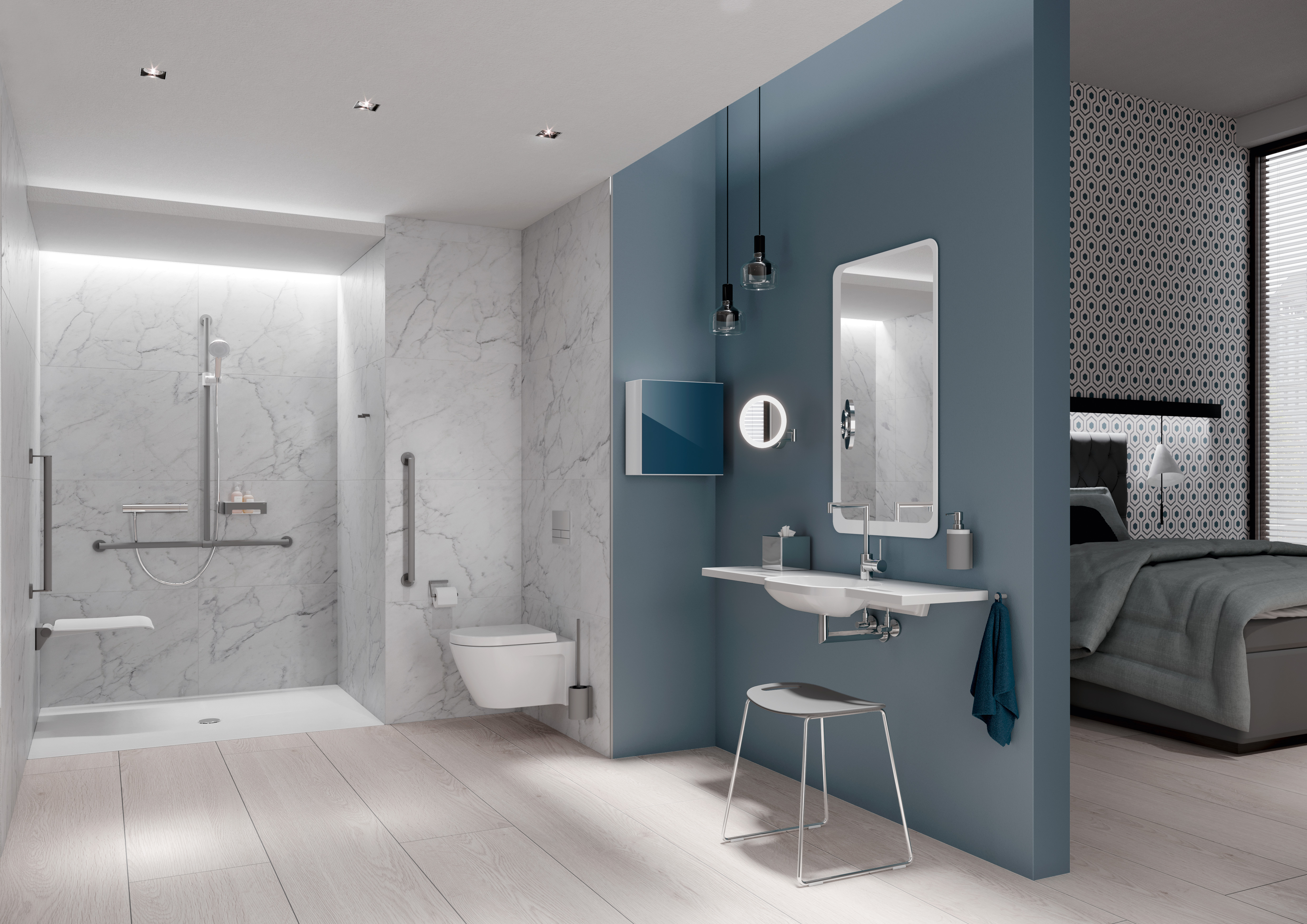 Le système 900 est la réponse aux exigences complexes des salles de bains sans barrières. Les produits sont bien pensés jusque dans les moindres détails : ils convainquent par leur fonctionnalité, leur qualité durable, leur technologie d'assemblage intelligente et leur conception hygiénique. Le système 900 répond aux exigences d'une grande variété de types de bâtiments, que ce soit dans la salle de bains ordinaire d'un hôpital, dans le service confort d'une clinique privée, dans une maison de soins ou dans une maison de retraite exclusive.