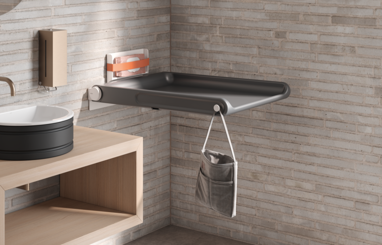 La nouvelle table à langer, HEWI combine une surface de couchage en mousse PUR couleur gris fer facile à nettoyer avec des composants métalliques robustes en blanc grainé mat. La fonction d’ouverture avec frein permet une manipulation en douceur, tandis que des crochets latéraux et un compartiment de rangement offrent un confort supplémentaire. La table à langer allie le respect des normes de sécurité les plus strictes et une manipulation confortable à un design moderne qui s’intègre parfaitement dans les espaces sanitaires publics. La table à langer a été conçue par Holscher Design, une agence danoise renommée et maintes fois primée, spécialisée dans la conception stratégique de produits et forte de plus de 50 ans d'expérience.