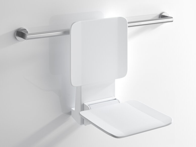 HEWI hangende stoelen kunnen bijzonder gemakkelijk aan de douche worden toegevoegd. Ze worden eenvoudigweg in vast geïnstalleerde HEWI-douchehandlijsten of grijpstangen gehaakt en zo vastgezet.